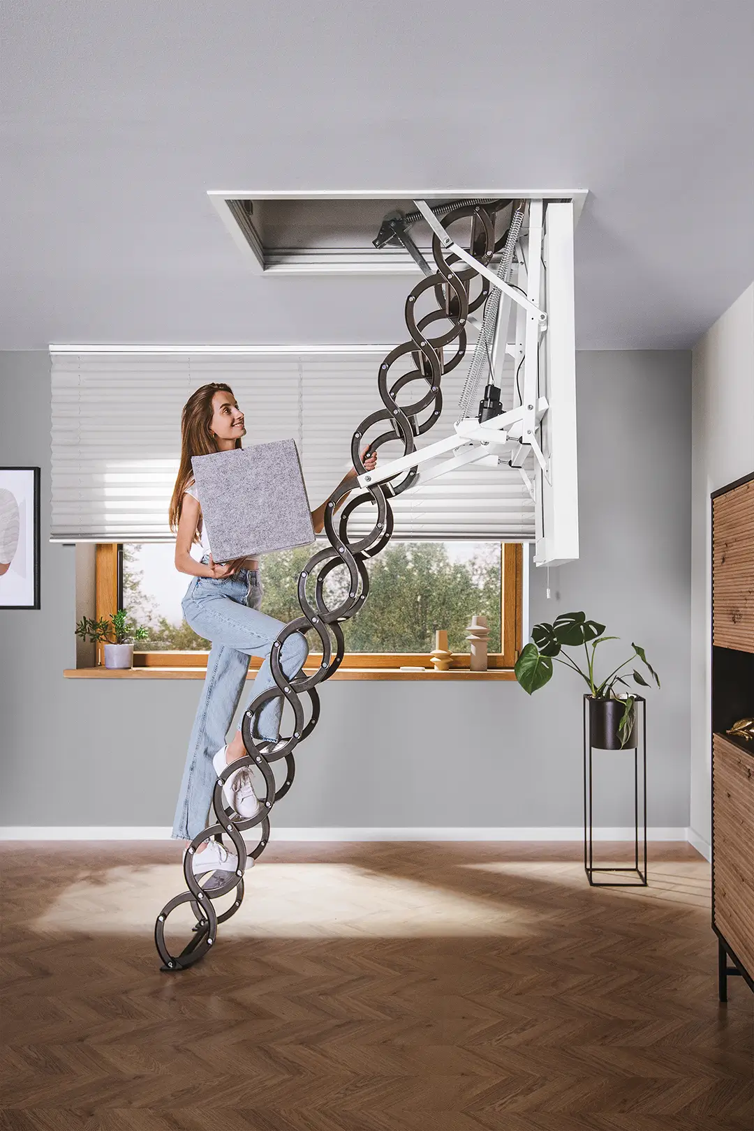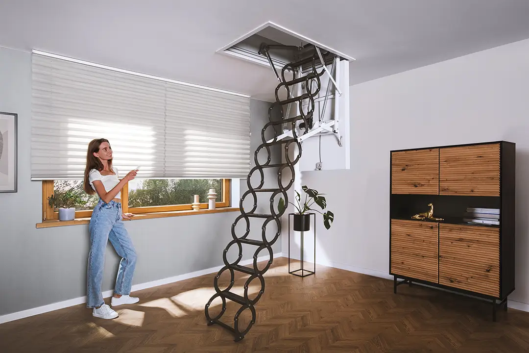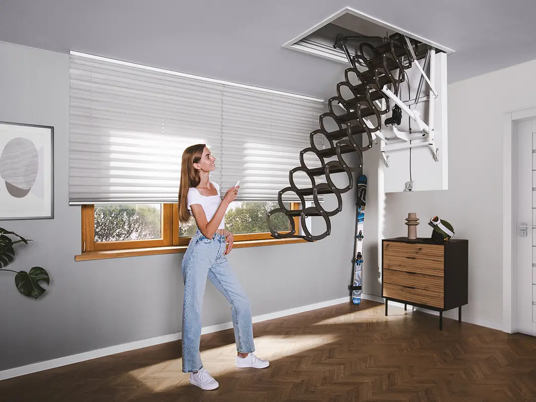 LET Electric bēniņu kāpnes nodrošina visaugstāko lietošanas komfortu. Tās tiek darbināti, izmantojot vienu no diviem pieejamajiem vadības komplektiem: Z-Wave vai WiFi (jāiegādājas atsevišķi). Katrs komplekts ir papildus aprīkots ar standarta sienas slēdzi. LET Electric bēniņu kāpnes garantē izcilus siltumizolācijas parametrus un augstu estētiku. Aprīkots ar šķērveida kāpnēm un tērauda rāmi, apdares līstēm un ātrās montāžas komplektu.