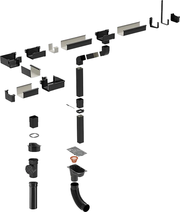 Elegantā un modernā forma padara jauno kvadrātveida PVC lietusūdens noteksistēmu ideāli piemērotu jaunākajām būvniecības tendencēm un ēku īpašnieku estētiskajām prasībām.